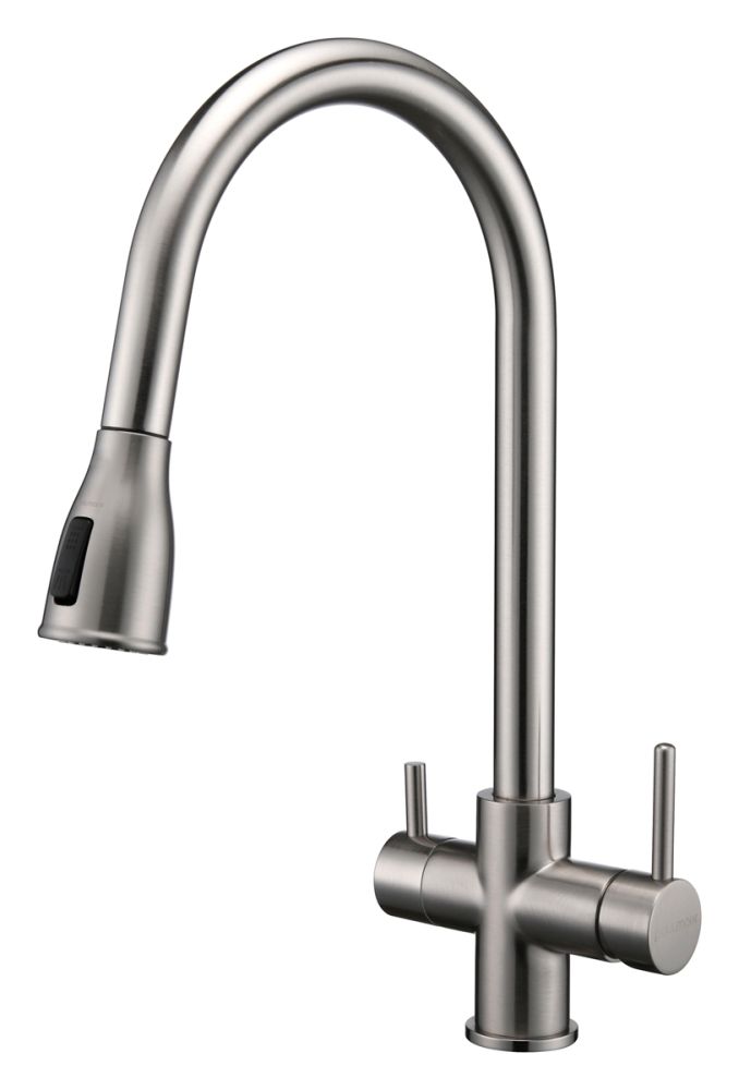 Смеситель LANGE оснащен функциями подключения фильтра питьевой воды, выдвижения излива и двумя режимами подачи водопроводной воды: струя и душ.